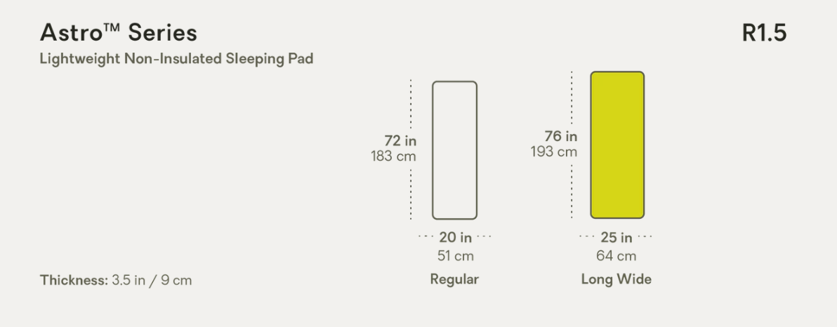 Astro maintains its legacy lateral baffles, which are more comfortable and prevent the pad from curling under the body. The Pillow Baffle™ at the head end bolsters your camp pillow and helps it not slide off in the middle of the night. Our super-efficient Vortex™ pump sack works seamlessly with our Laylow™ zero-profile, micro-adjustable valve for easy inflation and personalized comfort, and helps keep moisture out of your pad. Astro makes a great go-to pad for adventures anywhere.